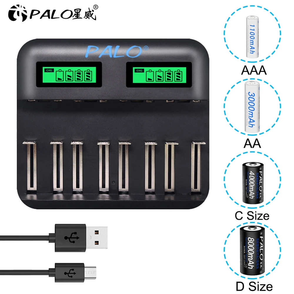 Best Product PALO 8 slots LCD display USB Smart battery Charger for AA AAA SC C D Size Rechargeable Battery 1.2V
