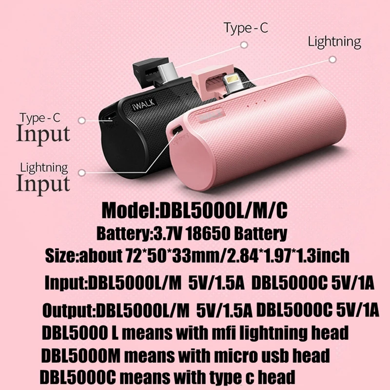 Best Product iWalk 5000mah Pocket Power Bank Type C with Built in MFI 8 Pin Cable 1.5A 1A for Apple iPhone X Xia