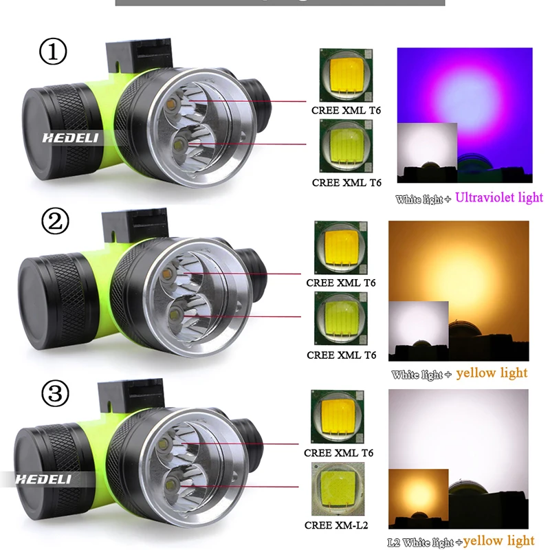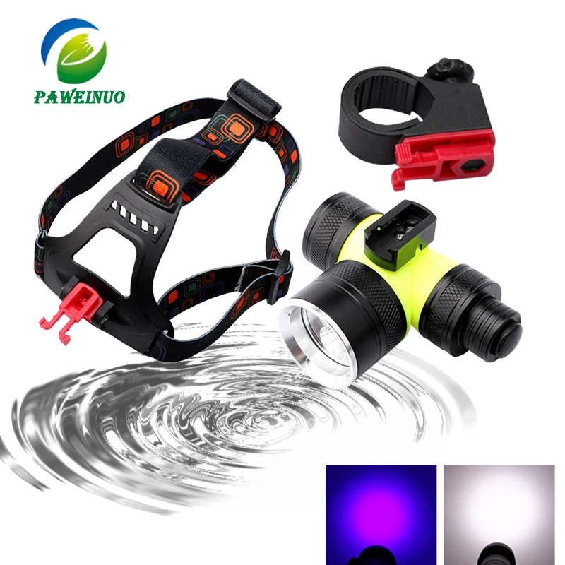 Led diving headlight flashlight UV purple yellow bicycle light rechargeable Underwater head light 26650 rechargeable battery